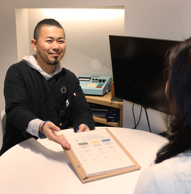 例)のぼせ、頭痛、肩こり、お腹の不調などに合わせて施術し、生活習慣の見直しと、必要に応じて薬・サプリメントを処方します。